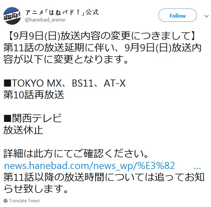 애니메이션 '하네바도!' 제 11화의 방송이 연기된다고 합니다.