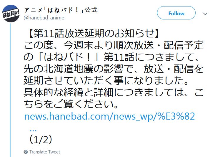 이번 홋카이도 지진의 영향으로 인해, 애니메이션 '하네바도!' 제 11화의
