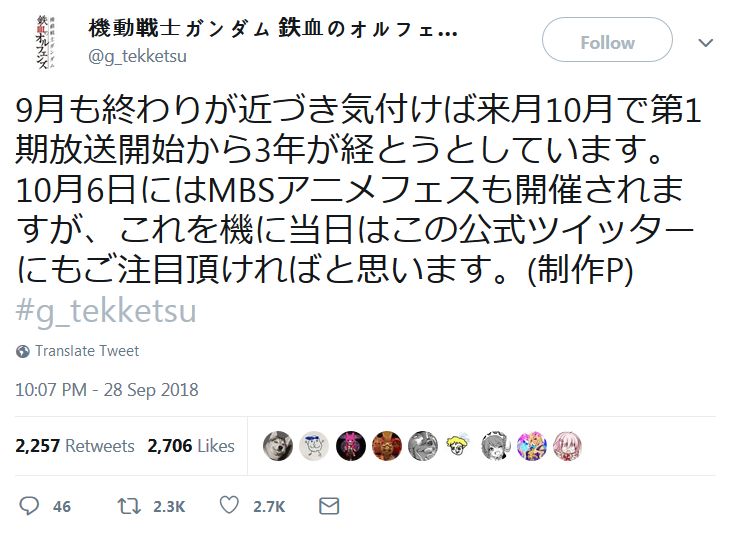 '기동전사 건담 철혈의 오르펜즈' 공식 트위터에 올라온 공지에 따르면,