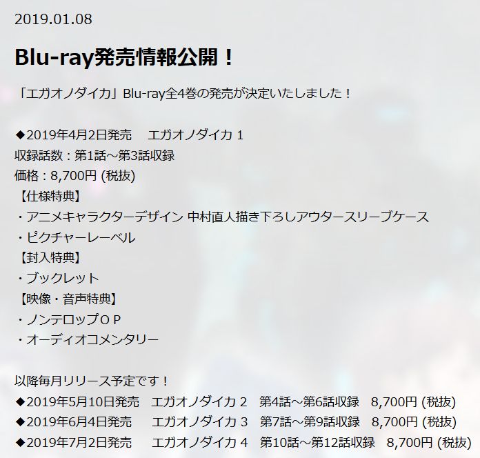 TV 애니메이션 '미소의 대가' 블루레이 전 4권, 2019년 4월 2일부터 순차 발매
