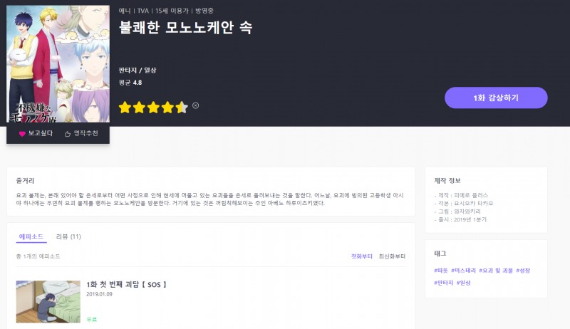 1412 [라프텔]『불쾌한 모노노케안 속』1화 업로드 [애니] 작성일시 : 2019. 01. 09 (00:48) 조회 : 2,266 / 댓글 : 0 1화 무료입니다. 출처(링크) : https://laftel.net/item/39079/ 4추천 글쓰기스크랩 신고