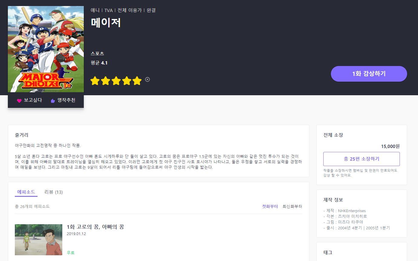1412 [라프텔] 『메이저』 1기 업로드 [애니] 작성일시 : 2019. 01. 12 (21:06) 조회 : 2,120 / 댓글 : 0 https://laftel.net/item/13953 4추천 글쓰기스크랩 신고