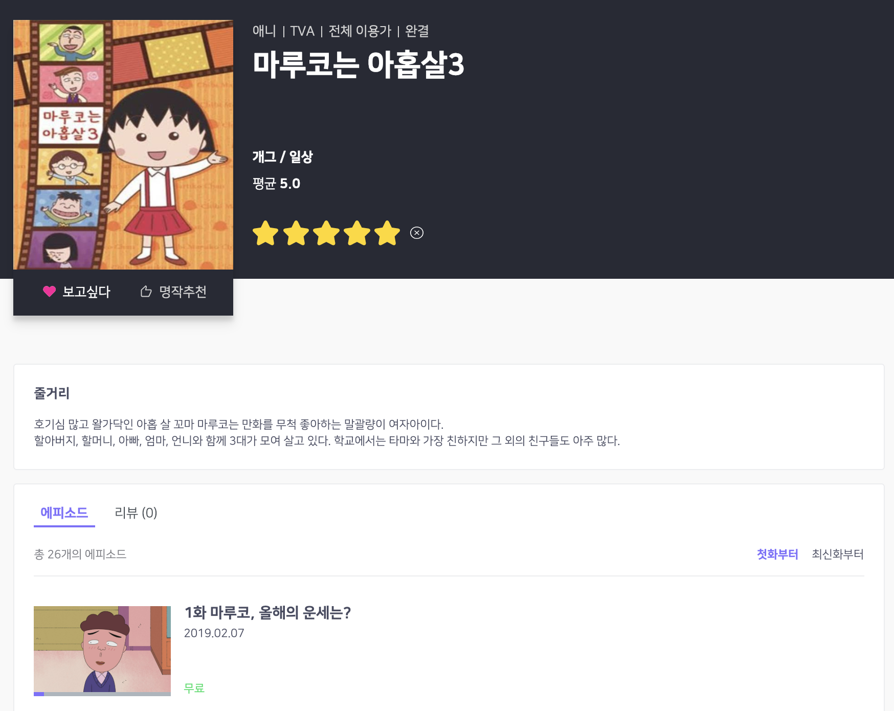 1412 [라프텔] 『마루코는 아홉살3』 업로드 [애니] 작성일시 : 2019. 02. 07 (16:04) 조회 : 2,191 / 댓글 : 0 1화 무료입니다. 출처(링크) : https://laftel.net/item/39185 4추천 글쓰기스크랩 신고