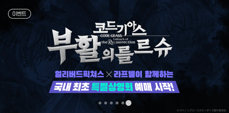 1412 [라프텔] 『코드기아스 부활의 를르슈』 특상회 예매 시작 [애니] 작성일시 : 2019. 02. 10 (14:06) 조회 : 2,195 / 댓글 : 0 출처(링크) : https://laftel.net/event/40 4추천 글쓰기스크랩 신고