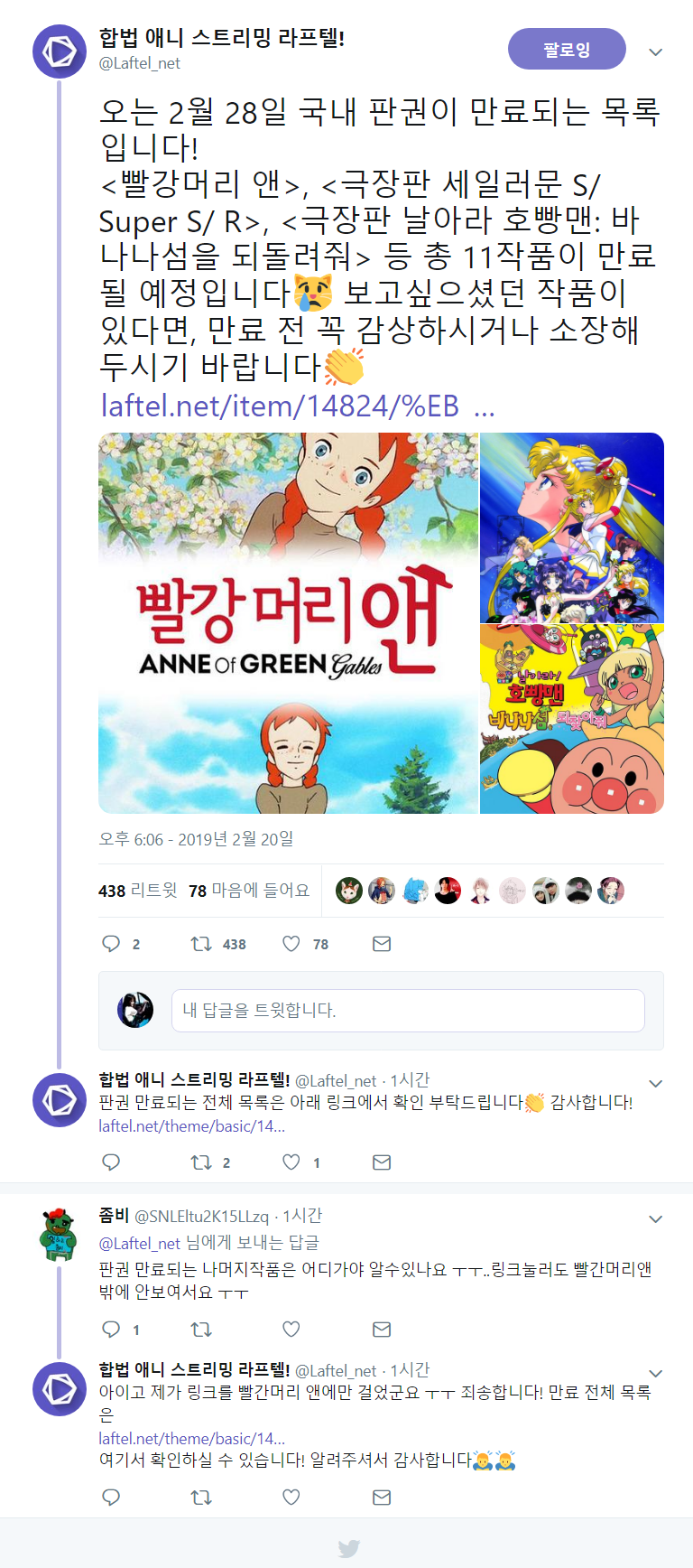 1412 [라프텔] 2월 28일 판권 만료 작품 안내 [애니] 작성일시 : 2019. 02. 20 (22:20) 조회 : 2,305 / 댓글 : 0 출처(링크) : https://twitter.com/Laftel_net/status/1098146786819039232 4추천 글쓰기스크랩 신고