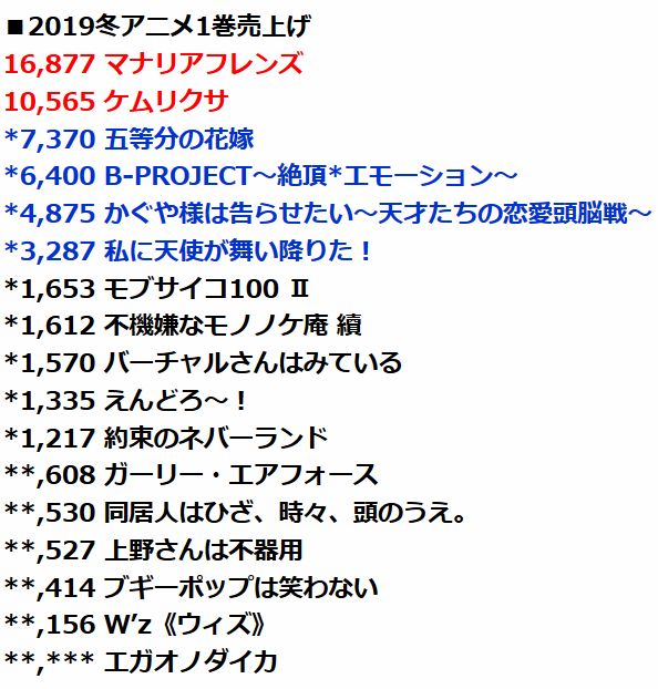 2019년 겨울(1월) 신작 애니메이션 제 1권 판매량 업데이트, 케무리쿠사 1만장 넘었네요.