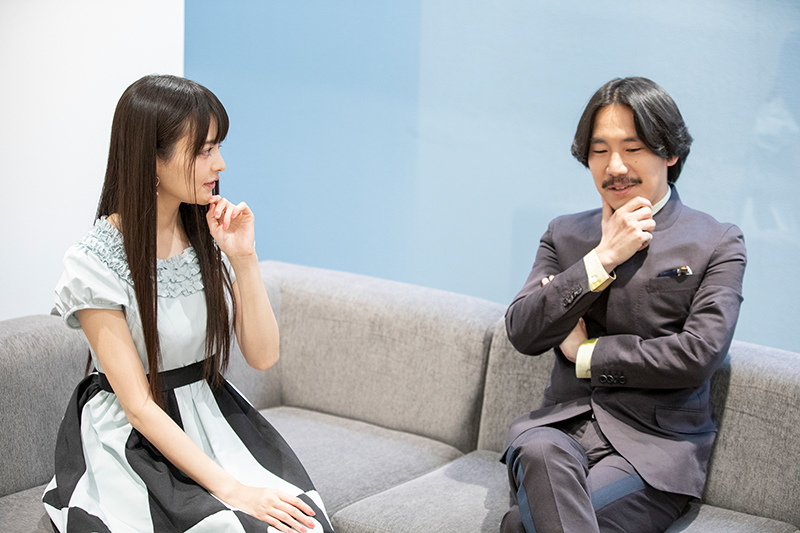 성우 우에사카 스미레와 싱어송라이터 키요시 류진씨의 대담 모습을 찍은 사진