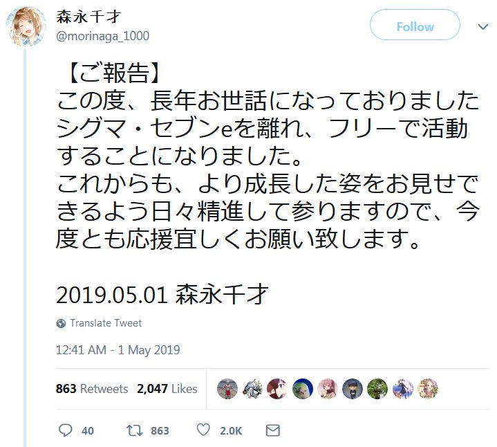 성우 모리나가 치토세, 시그마 세븐e를 떠나서 프리랜서로 활동하게 되었답니다.