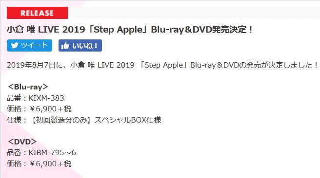 성우 오구라 유이의 라이브 투어 2019 'Step Apple' 블루레이 발매 소식