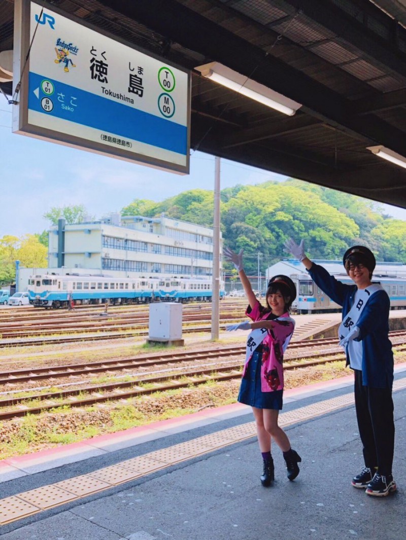 성우 하나에 나츠키 & 키토 아카리의 사진, 도쿠시마 역 1일 역장 이벤트