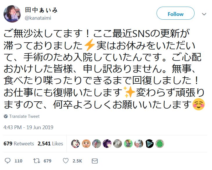 성우 다나카 아이미가 그동안 휴가를 받아서 수술과 입원을 했음을 밝혔답니다.