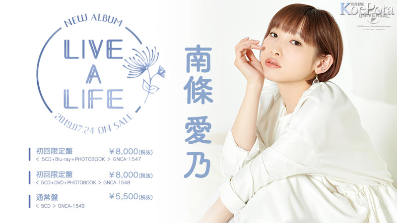 성우 난죠 요시노씨의 새로운 앨범 'LIVE A LIFE'의 재킷 사진과 수록
