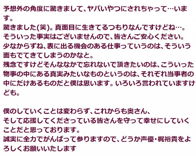 성우 카지 유우키, 라디오 방송에서 자신과 관련된 소문을 염두에 둔 듯한 발언