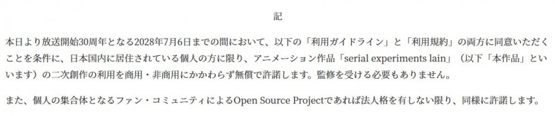 애니메이션 'serial experiments lain'의 상업적 이용까지 가능한 2차 창작 가이드라인 공개