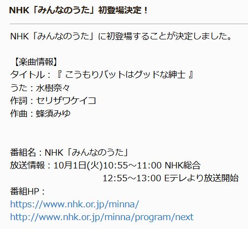 성우 미즈키 나나씨가 NHK의 5분짜리 음악 프로그램 '모두의 노래'에 처음으로 등장