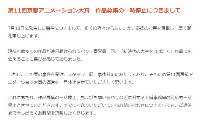 방화 사건 관련, 교토 애니메이션 대상 작품 모집 일시 중지, 팬 감사 이벤트 내용 전면 재검토