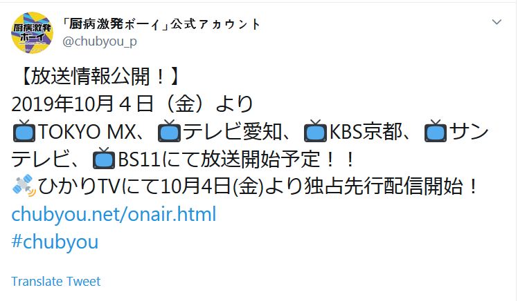 TV 애니메이션 '중병격발 보이'가 2019년 10월 4일부터 도쿄MX에서 방송 개시될 예정