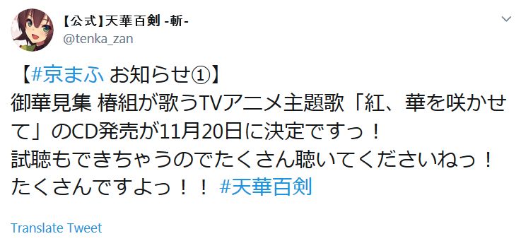 '천화백검' 숏 애니메이션, 주제가 CD는 2019년 11월 20일에 발매될 예정