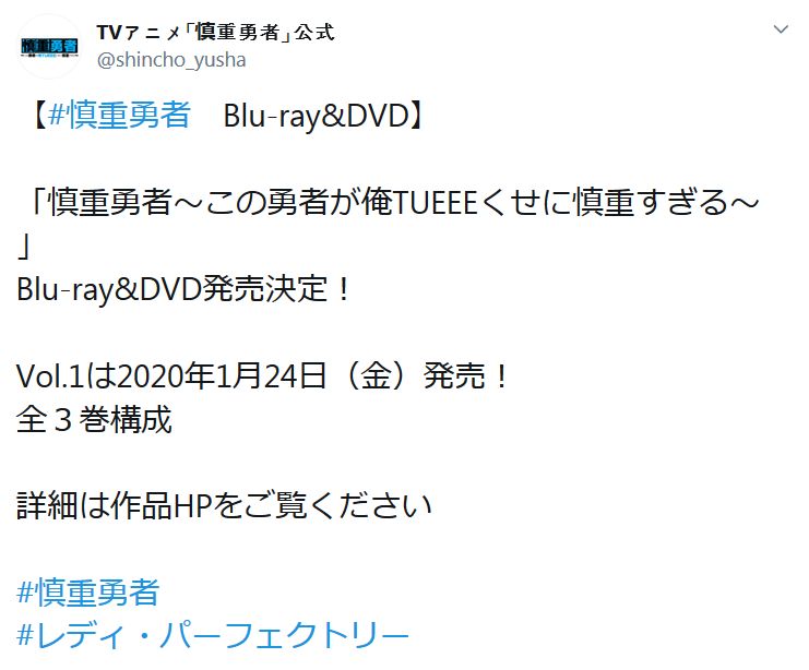 TV 애니메이션 '신중용사' 블루레이가 2020년 1월 24일부터 전 3권으로 발매될 예정