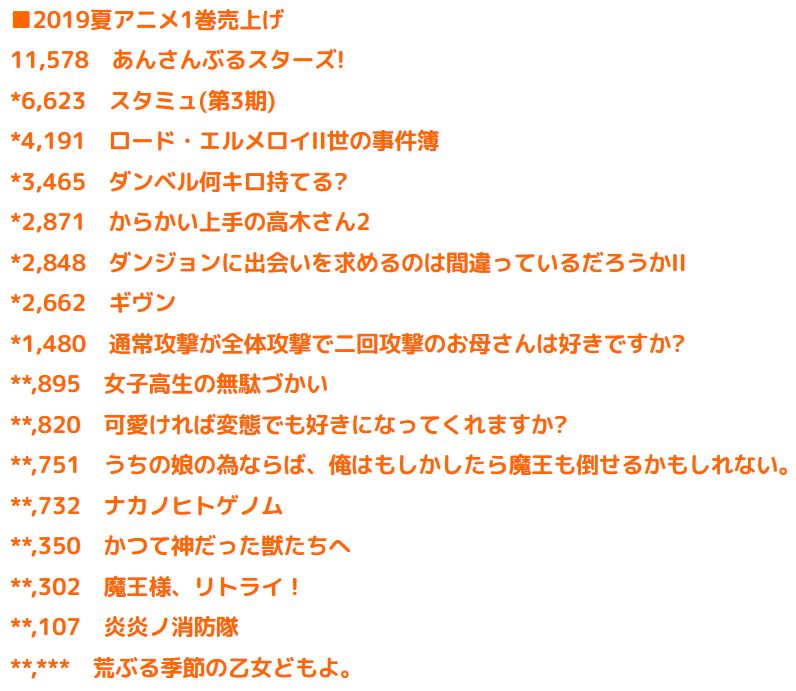 * 2019년 7월 (여름) 시즌 애니메이션 제 1권 판매량 랭킹