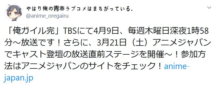 TV 애니메이션 '역시 내 청춘 러브코메디는 잘못됐다. 완'은 2020년 4월 9일 심야부터 방송 시작