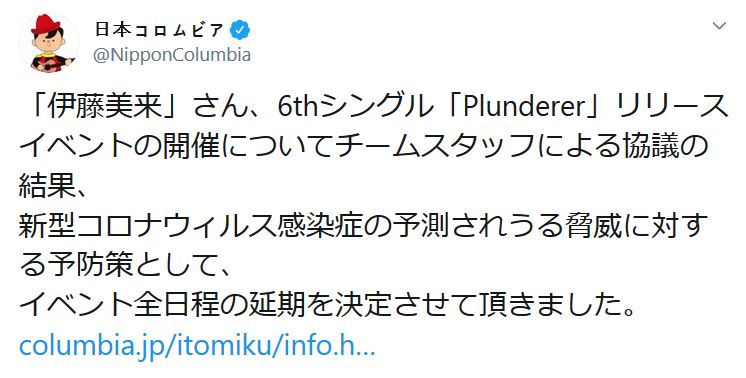 성우 이토 미쿠의 6번째 싱글 음반 'Plunderer'의 발매 기념 이벤트가 전부 연기되었답니다.