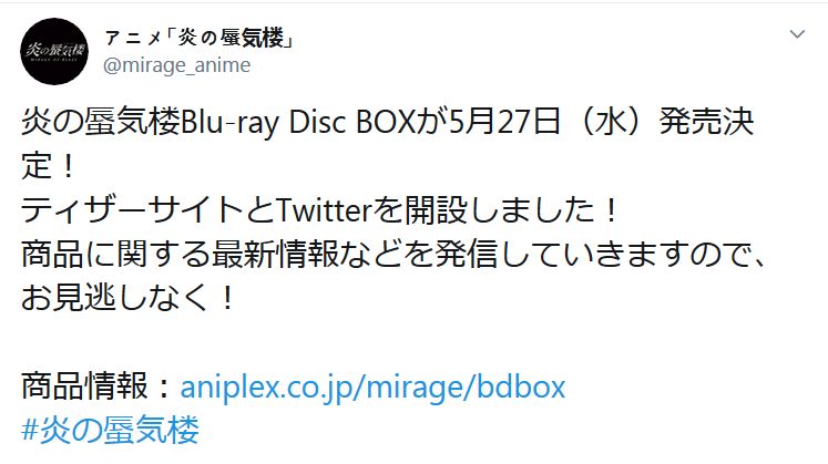 '불꽃의 미라주'의 블루레이 박스가 2020년 5월 27일에 발매될 예정이랍니다.