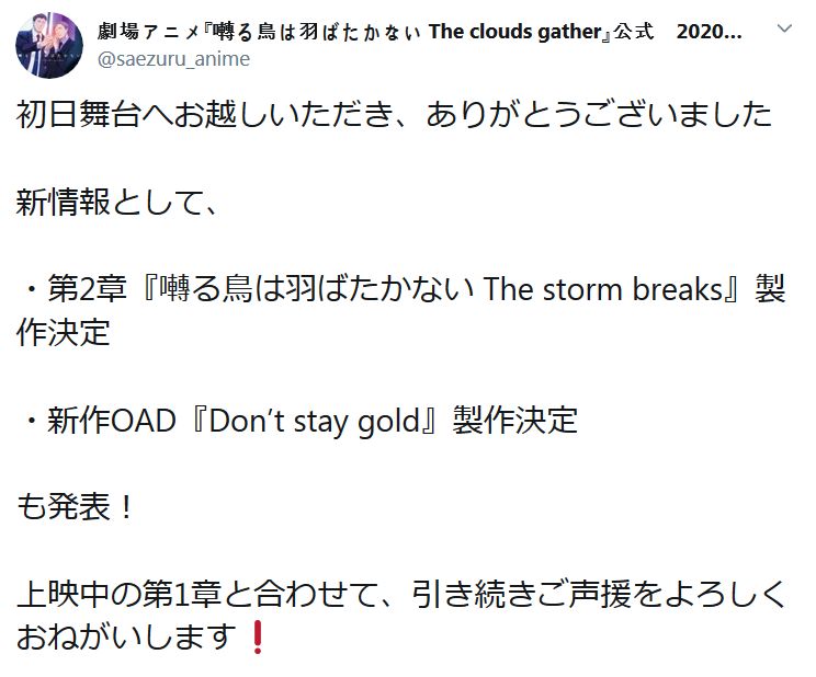 극장 애니메이션 '지저귀는 새는 날지 않는다' 시리즈 제 2장 및 OAD 제작 발표