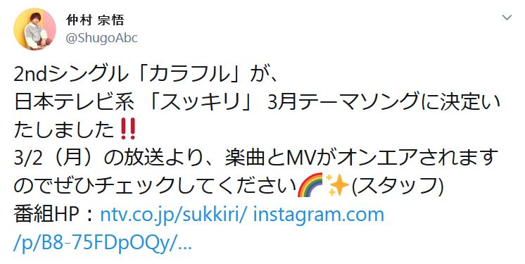 성우 나카무라 슈고의 악곡 '컬러풀'이 닛폰TV '슷키리'의 테마송으로 결정