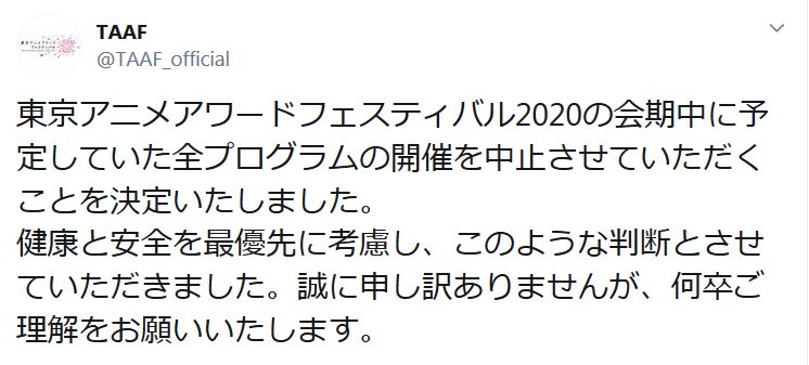 도쿄 애니메이션 어워드 페스티벌 2020, 모든 프로그램이 중지된다는 발표가 나왔네요.