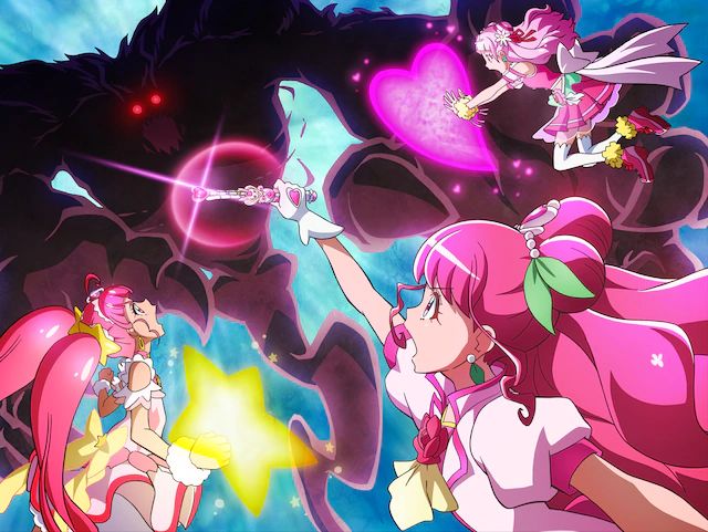 과 맞서는 큐어 그레이스, 큐어 스타, 큐어 옐의 모습이 그려져 있