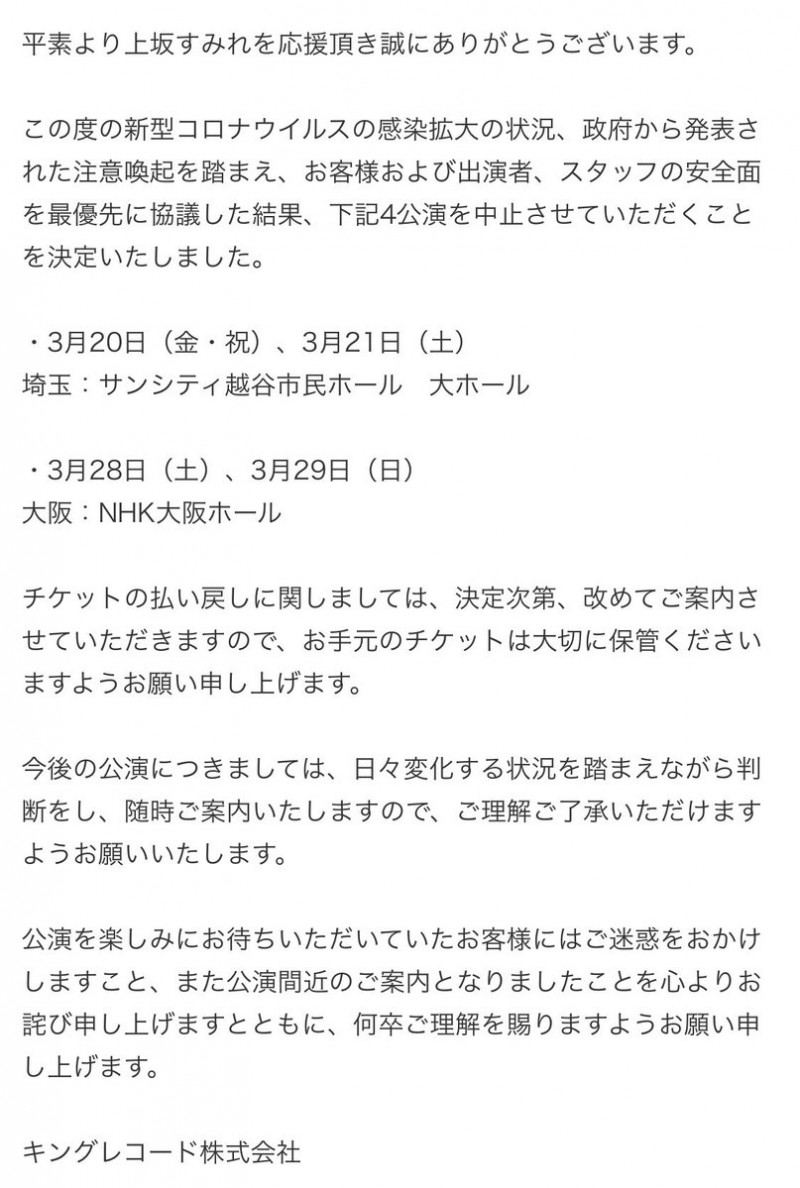3월 28일과 29일에 오사카에서 개최될 예정이던 '우에사카 스미레의
