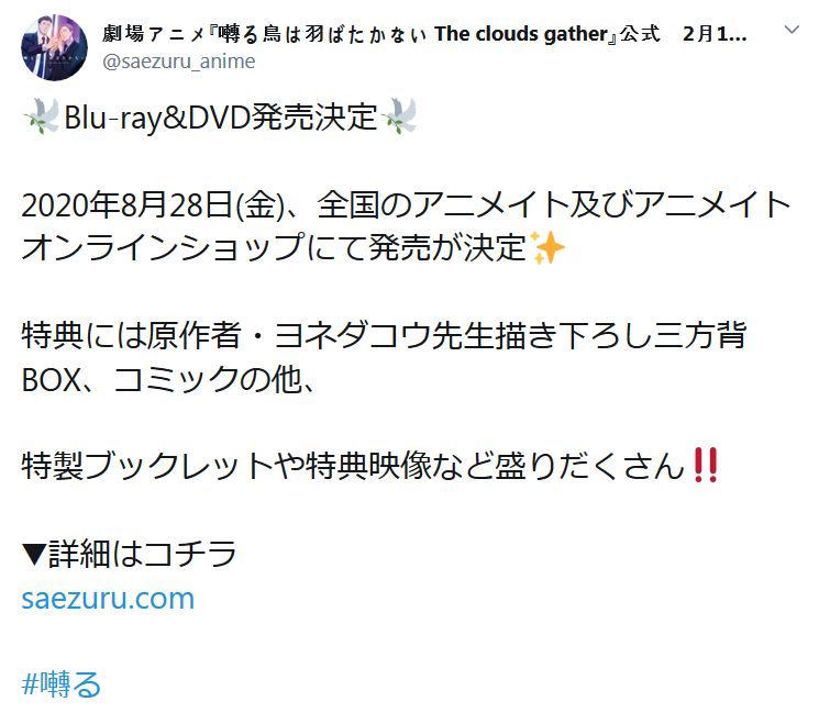 극장 애니메이션 '지저귀는 새는 날지 않는다' 블루레이 발매 소식