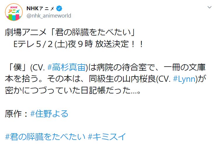 극장 애니메이션 '너의 췌장을 먹고 싶어'가 NHK 교육TV에서 방송될 예정