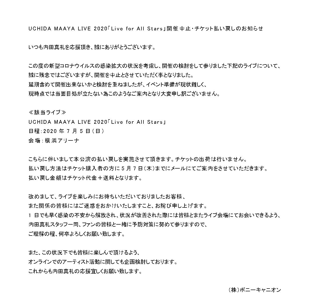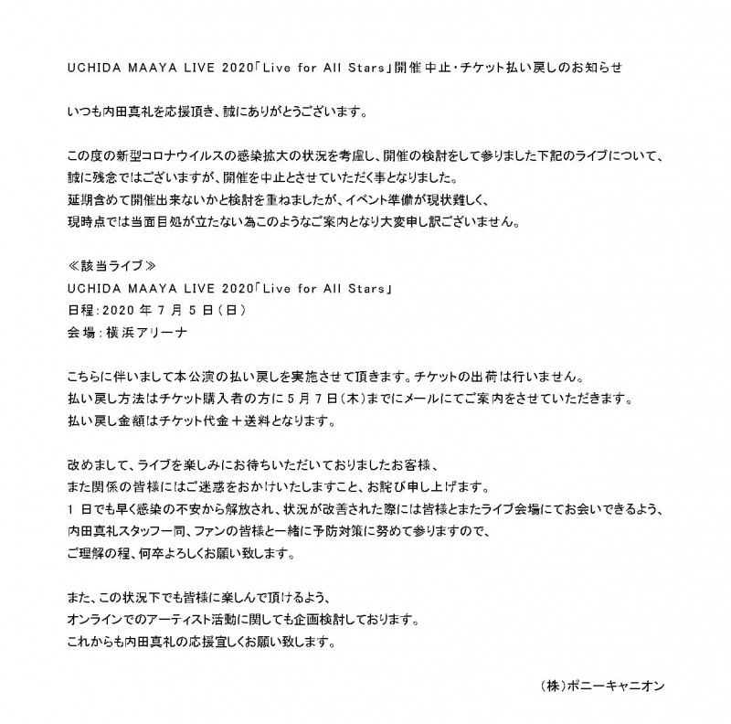 공연 'UCHIDA MAAYA LIVE 2020 - Live for All Stars'가 중지되었다고