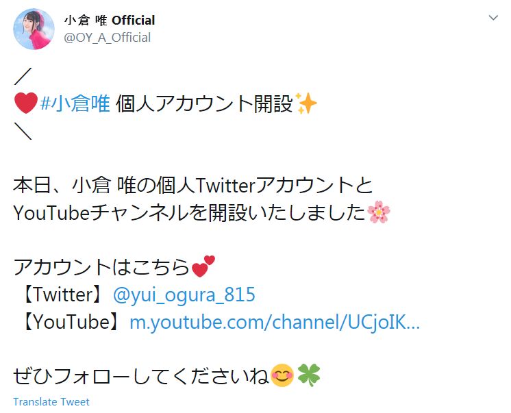 성우 오구라 유이의 개인 트위터 계정 및 유튜브 채널이 개설되었다고