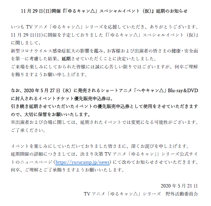 '유루캠프' 시리즈와 관련해서, 2020년 11월 29일에 개최될 예정이었