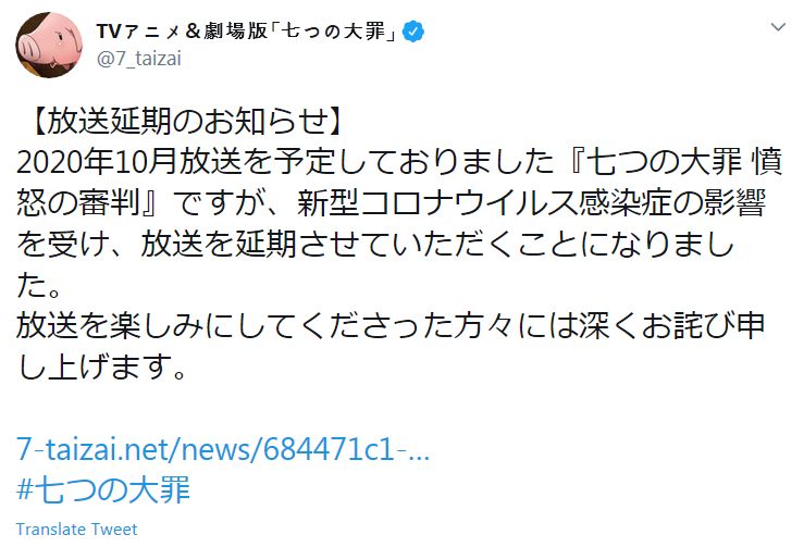 2020년 10월에 방송될 예정이었던, TV 애니메이션 '일곱개의 대죄