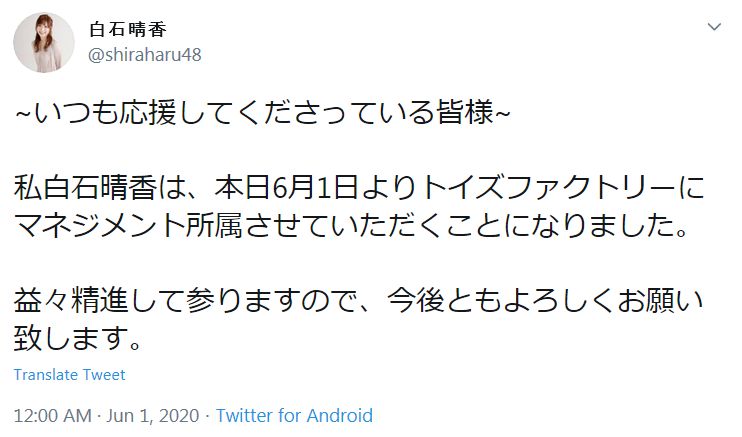 성우 시라이시 하루카, 2020년 6월 1일부터 토이즈 팩토리 소속