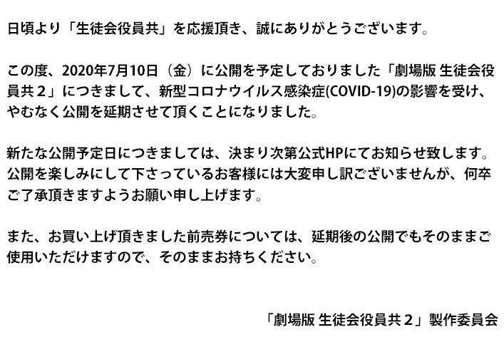 극장판 학생회 임원들2 개봉 연기 발표, 신종 코로나 바이러스의 영향