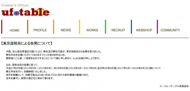 ufotable측은 공식 홈페이지에서 '폐사 및 폐사 대표가 도쿄국세국으로