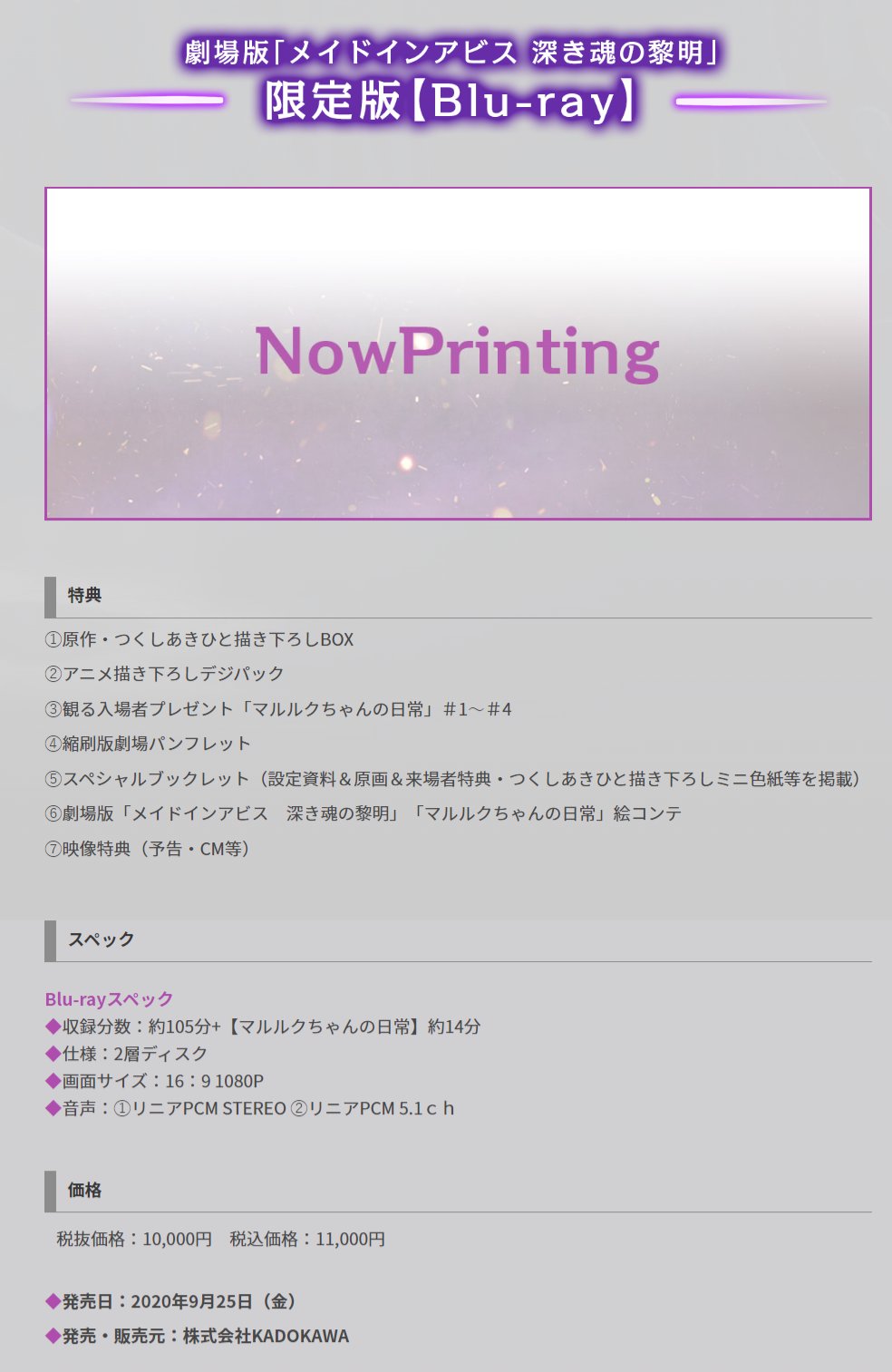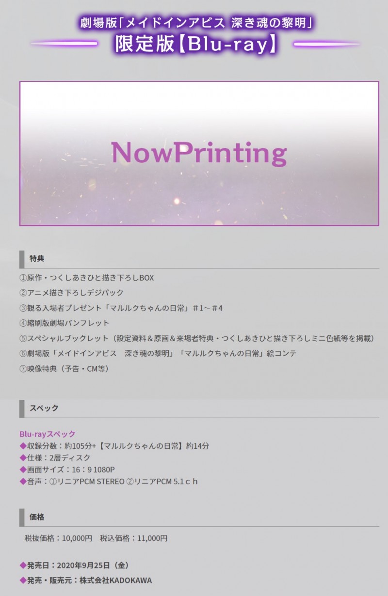 극장판 메이드 인 어비스 깊은 혼의 여명, 블루레이는 2020년 9월 25일 발매 예정