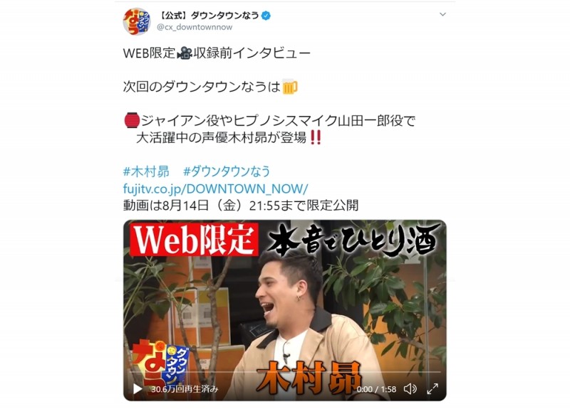 성우 키무라 스바루, 2020년 8월 14일, '다운타운나우'에 게스트 출연 예정