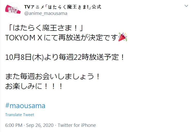 뛰는 마왕님!'이 도쿄MX를 통해 재방송될 예정이라고 합니다. 공식