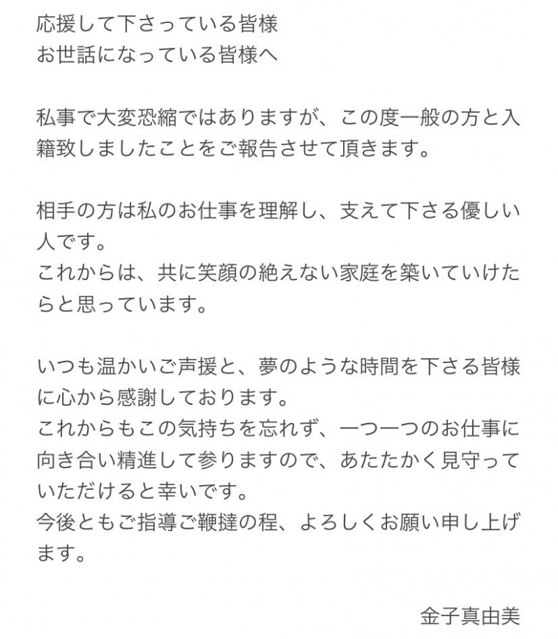 성우 카네코 마유미가 자신의 트위터에서 일반인과 결혼했음을 발표