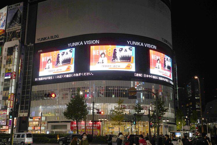 만화 '괴수 8호'의 프로모션 영상이 신주쿠 유니카 비전에서 방영 개시