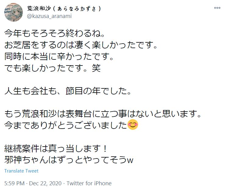 성우 아라나미 카즈사씨의 트위터에 사실상의 성우 은퇴 선언이