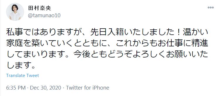 성우 타무라 나오, 자신의 트위터에서 결혼 사실 발표