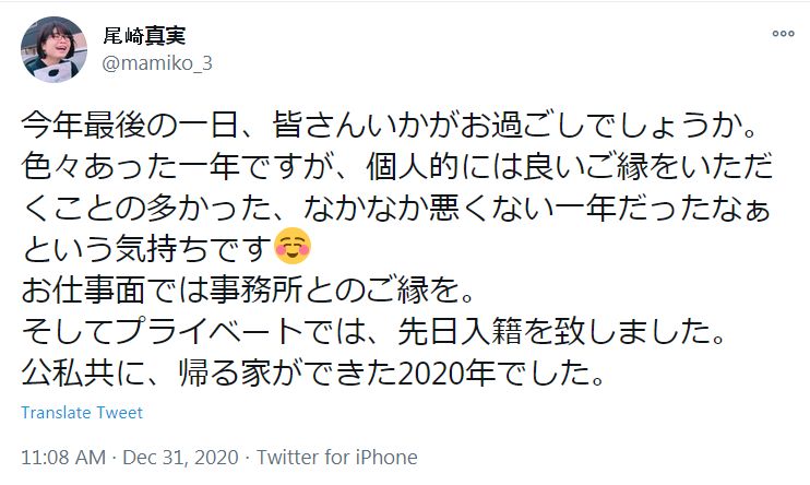 성우 오자키 마미, 트위터에서 결혼 사실 발표