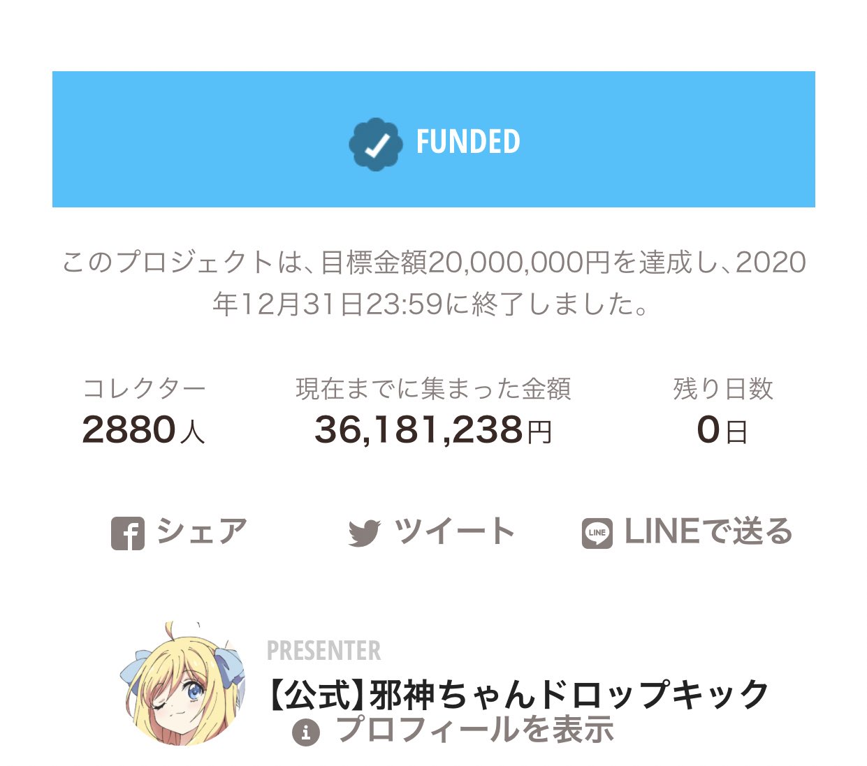 진행되어, 최종적으로는 3600만엔이 넘는 거금이 모인 모양입니다.